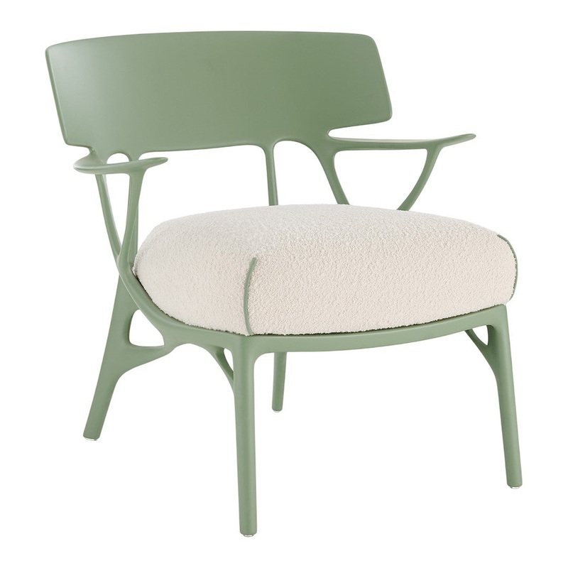 A.I. LOUNGE is the new armchair from the A.I. family that combines sustainable materials and comfort with a graphic design that looks to the future and well-being in our living spaces. An armchair for the living room in which the contours, a distinctive feature of the collection, are combined with maximum seating comfort. Available in white, black, orange and grey and in versions with and without a cushion for indoor and outdoor use.The added value of A.I. lies in the fact that it is the first product family conceived by Artificial Intelligence in response to input received from the designer (Philippe Starck) and the know-how of the company (Kartell). Specifically, creative thinking, company know-how and artificial intelligence have merged to develop a chair model based on an algorithm that respects the original brief of the designer and the company a comfortable product with the structural strength and solidity required while upholding one of Kartell’s main values: to be an injection-moulded industrial product of outstanding aesthetic quality.