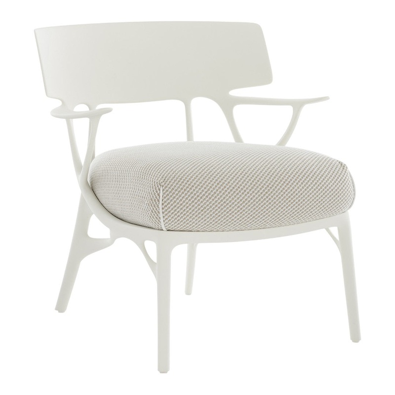 A.I. LOUNGE is the new armchair from the A.I. family that combines sustainable materials and comfort with a graphic design that looks to the future and well-being in our living spaces. An armchair for the living room in which the contours, a distinctive feature of the collection, are combined with maximum seating comfort.Available in white, black, orange and grey and in versions with and without a cushion for indoor and outdoor use.