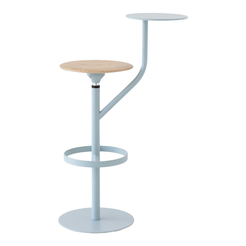 In a single line, dynamic and minimal, two functions, stool and coffee table together with an integrated footrest. It is called AARON, double A in the name, to underline the multi-tasking generosity of a design that limits the overall space and guarantees privacy and relaxation. From a metal stem, a padded seat and a pivoting table top sprout. Functionality and elegance in times of newfound openness and confidentiality. Floor fixing possible.