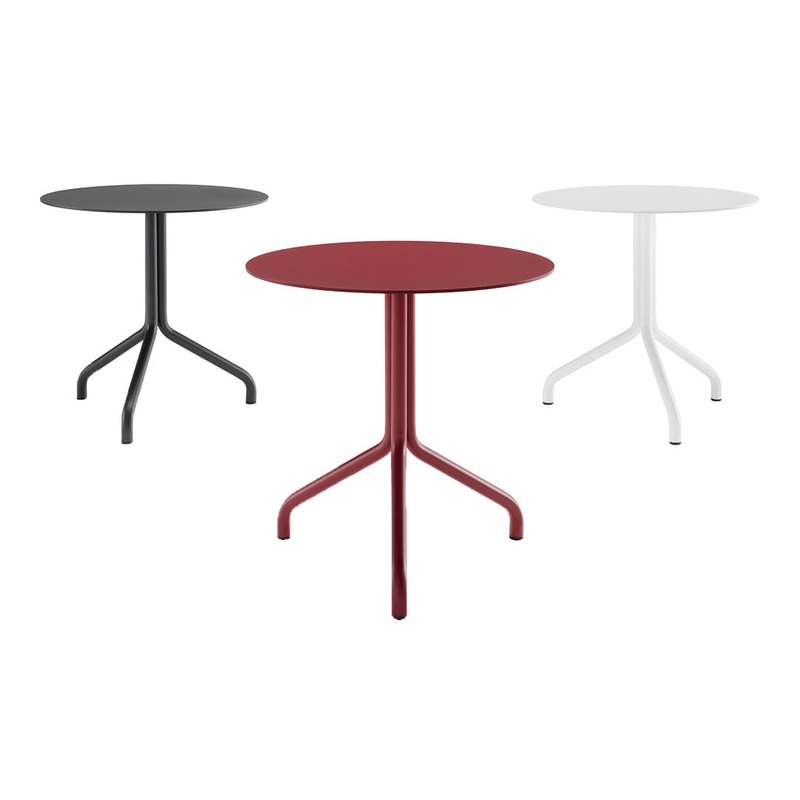 The series, made with separate bases and tops, is proposed in various configurations, with a pair of metal legs supporting the marble or wooden tops inserted at varying distances, depending on the size and the circular or elongated shape of the top.