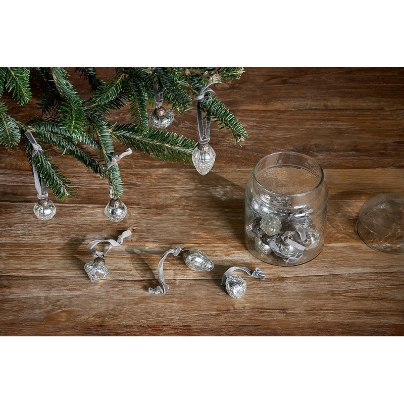 Inspired by traditional sweet jars, these elegant glass pots are filled with a selection of traditional silver glass baubles in mixed shapes. Easy to store and keep safe year after year. Both the jar and decorations are made from recycled glass. Each set includes sixteen baubles and velvet hanging ties.