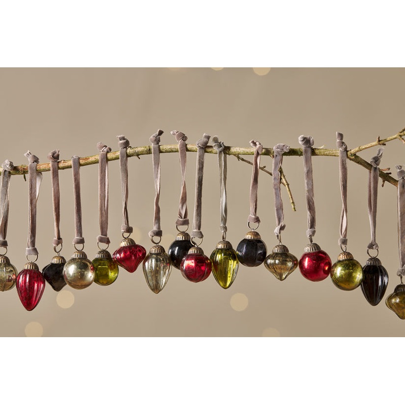 Inspired by traditional sweet jars, these elegant glass pots are filled with a selection of traditional glass baubles in a mix of festive colours and shapes. Easy to store and keep safe year after year. Both the jar and decorations are made from recycled glass. Each set includes sixteen baubles and velvet hanging ties.