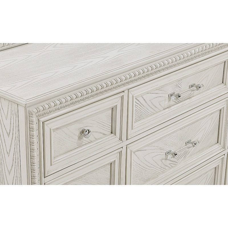 Introducing a bedroom collection that brings a breath of fresh sophistication to any living space. This suite boasts a bright, antique white finish that immediately brightens and opens up a room, providing a versatile foundation for any decor style. The bed’s commanding headboard stands as a stately centerpiece, with architectural paneling details that convey a sense of sturdy elegance. Storage needs are gracefully met by the dresser and chest, each accented with refined drawer pulls that offer a subtle contrast and easy access.