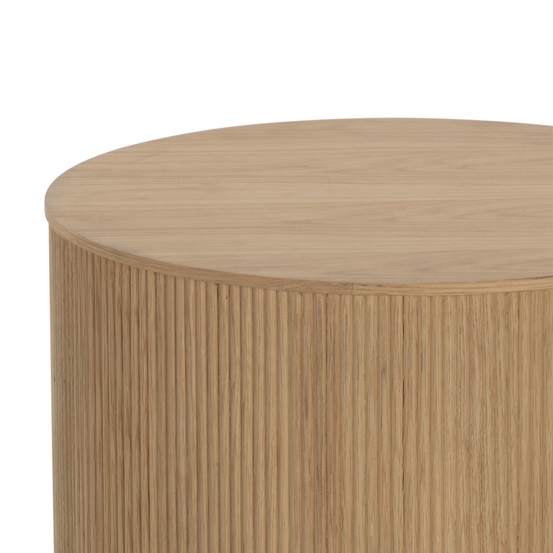 The Alvaroo Side Table brings form and function to life. Crafted with a rustic oak veneer with vertical reeding. A gold steel base finishes the look.