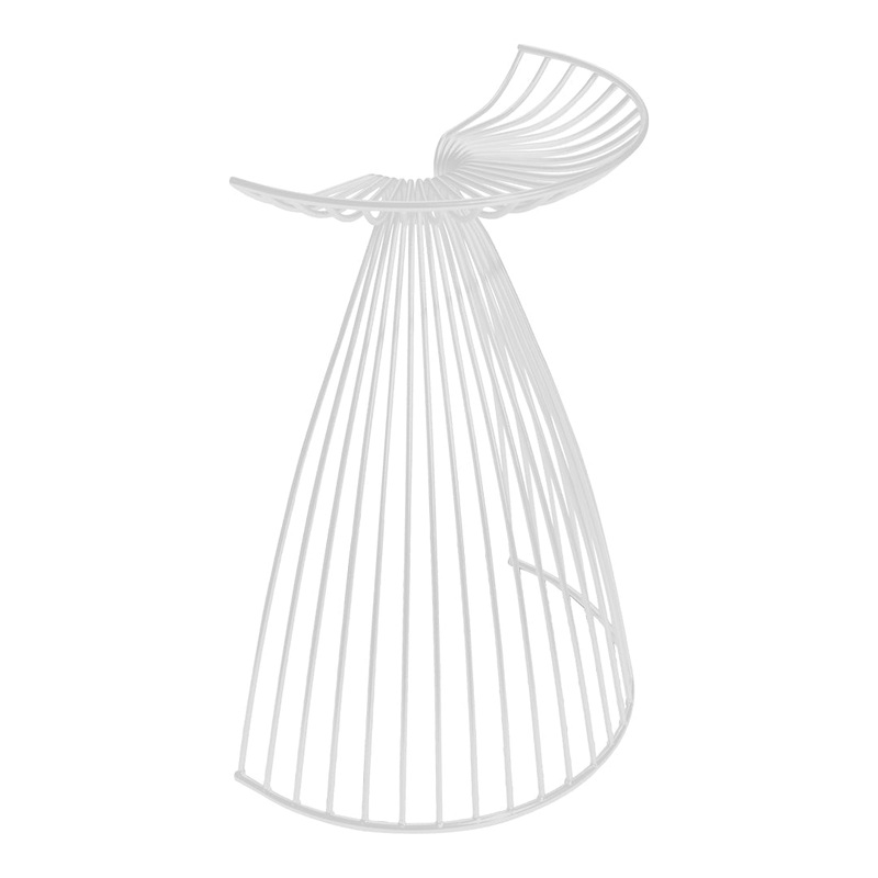 A sculptural bar stool with a poetic shape evoking an angel with its wings widely spread. The Angel stool consists of a minimalistic seat and a base of steel rods. It is a decorative yet comfortable piece, that can be used as either a bar stool or a freestanding, agile, sculptural object to decorate indoor or outdoors. Angel is the perfect example of efficient use of eco-design strategies: it is made of one single material, making it easy to recycle while minimizing the number of links in the supply chain. This also makes it easy to recycle.