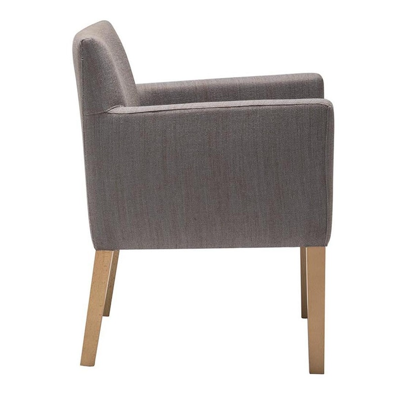 Lounge chair with upholstered seat and backrest, and solid beech wood frame.