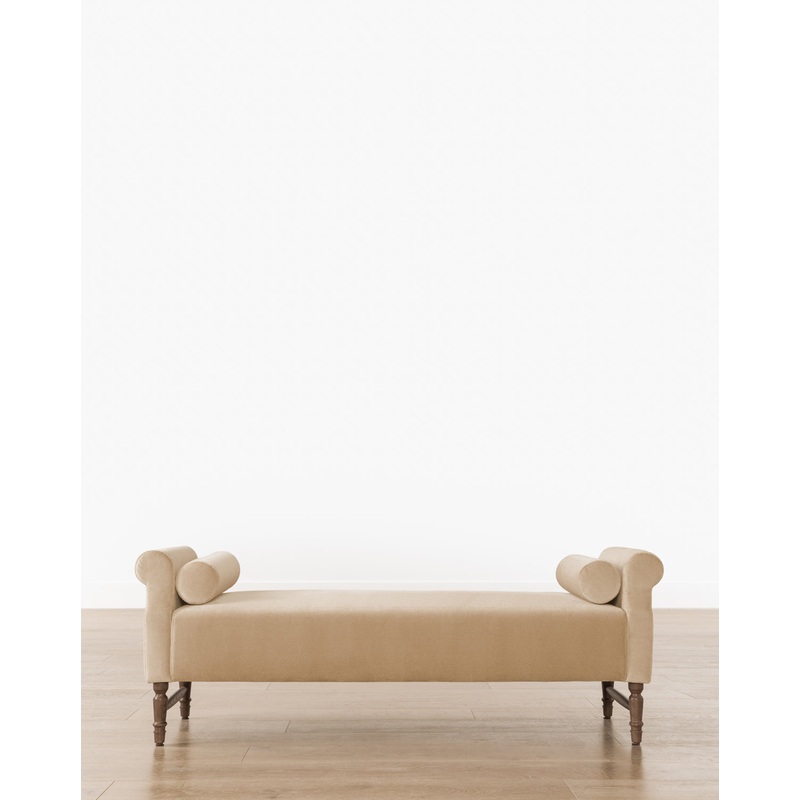 An updated take on a classic design, the Asher Bench welcomes rest while seamlessly lending a playful feel to the home with its pair of bolster pillows. A wide, welcoming seat cushion rests on an elegantly crafted base and is available in either a charcoal & ivory striped linen or a fawn cotton velvet.