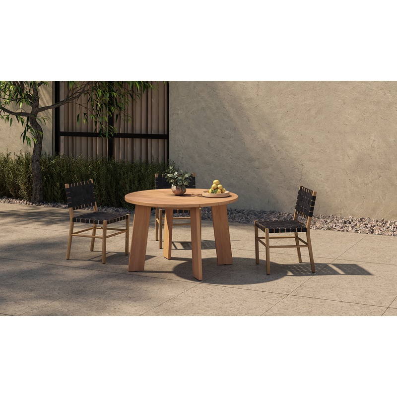 Embodying contemporary sophistication, this solid teak table celebrates natural material. The Asher outdoor dining table’s angular legs provide a striking contrast to the round, curved top, creating a minimalist yet elegant aesthetic. Over time, the table embraces a unique silver-grey patina as the teak and oils naturally weather. Though the process lends to its character, a teak sealer can be applied to maintain its original allure.