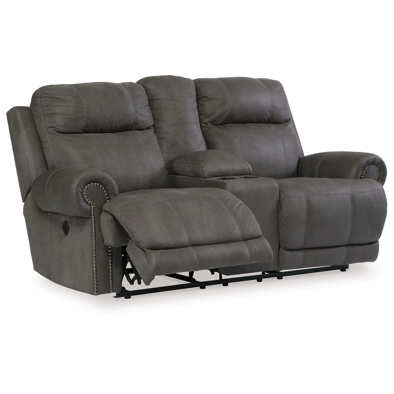 Sparing that “puffy” look you might expect from a recliner, this reclining loveseat with console doesn’t hold back when it comes to contemporary style. Subtle touches such as sporty jumbo stitching, nailhead trim and a “weather worn” effect on the upholstery give this handsome piece a buttoned-up appeal and fresh feel. Center console with dual cup holders brings a handy element to this handsome piece.
