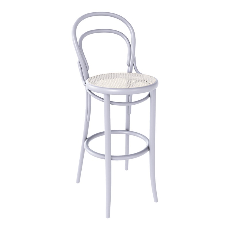 This classic chair No. 14 has been transformed into a barstool. Manually bent beech wood is used for the frame. The seat can be made of plywood, with a decorative relief, cane mesh or it can be upholstered in all types of materials.