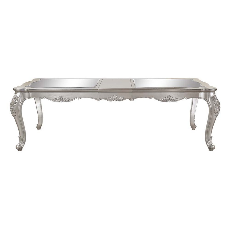 An ode to traditional glamour, the Devayne dining table brings in all the allure and charm that you are seeking for a dining table. The table features an extension leaf that allows for additional dinner guests. The champagne finish enhances the beautiful floral moldings on the legs and apron. The tabletop features mirrored panels that highlight your dinnerware.