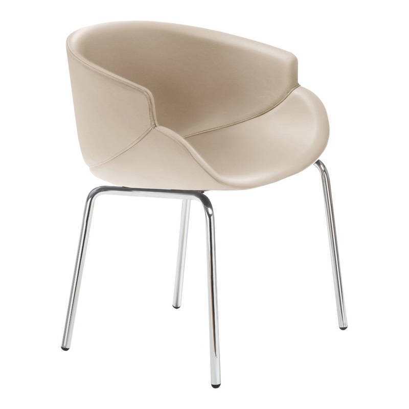 Small armchair with distinctive lines, characterised by a sharp and sinuous groove in the frame which forms two half shells: the seat, soft and inviting, fits against the accentuated and enveloping profile of an ample backrest. The result is a neat and comfortable seat with armrests, perfect for both contract and home environment use. Fully upholstered in fabric or hide, it is available with legs in natural beech or metal, in a swivelling version with chrome plated spoked base or on Castors.