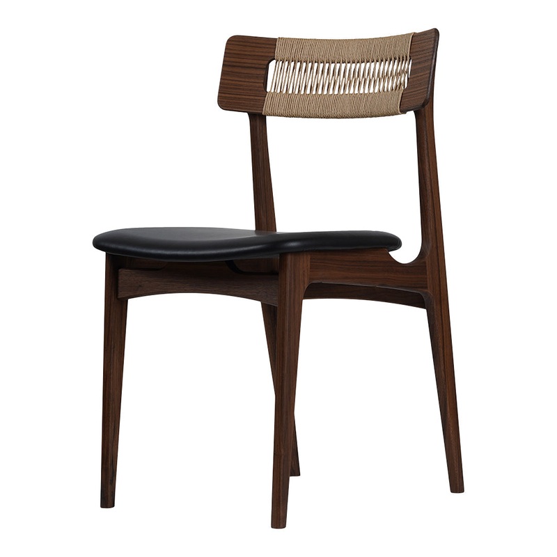 The curved seat, which is crafted from multiple layers of veneer, appears to float above the legs and is ideal for upholstering. On request, the seat can be upholstered in a variety of fabrics and leather and complements a variety of interiors and styles. The curved backrest is available in hand-woven Danish natural paper cord.
