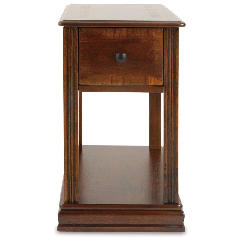 Inlay accents, fluted details and an oil-rubbed effect on the rich finish give this chairside end table such great character. The base shelf is just the place for a storage basket, decorative vase or other accent piece. Youll love the deep drawer with removable tray offering handy storage, too.