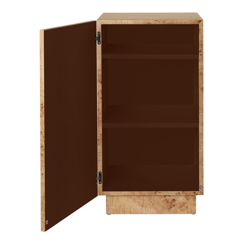 The Burl Side Table has its namesake from the beautifully patterned, FSC certified burl wood it is made of. This versatile and sleek piece serves as both a nightstand and a side table, adapting effortlessly to your needs. Its hidden storage space includes an adjustable shelf that can be moved according to the items being stored. The pedestal-like design exudes an elegant expression that enhances the overall aesthetics and ambiance of any space.