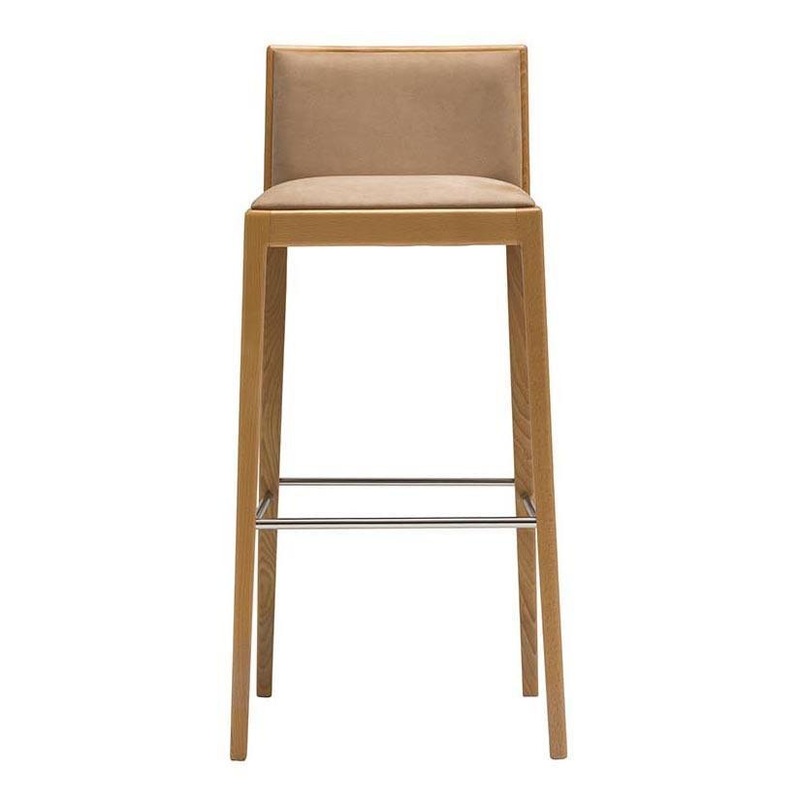 Barstool with upholstered seat and backrest and solid beech frame.