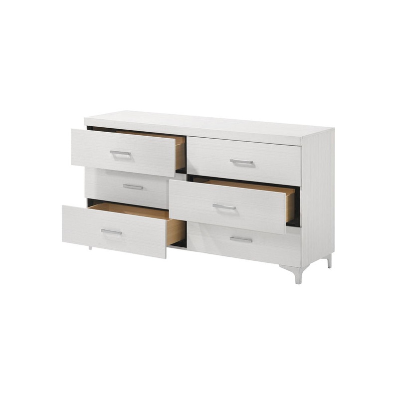 The Casilda bedroom collection will help you create the perfect retreat. In a white finish to easily style and works with various color schemes. Tying each piece together are the metal legs. The bed boasts a PU padded headboard with button tufting in a gray color. The headboard also includes LED lighting to illuminate your room at night. Complete your bedroom with matching case goods.