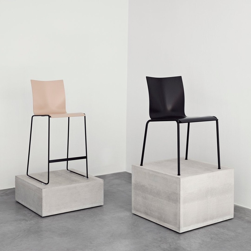 This version of Chairik is a counter stool with a sled base and a low back that is ideal for dining room settings. The bottoms of the runners are equipped with plastic glides, which act as spacer blocks when stacking. It is unupholstered and is available in a variety of colors and surfaces, including melamine, lacquer, PUR integral foam, plastic and lazure.