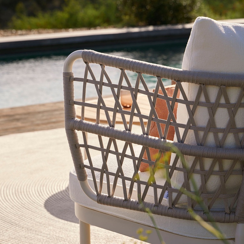Lounge chair designed by Patrick Norguet with powder-coated aluminum frame and hand-braided backrest in flat rope, forming a unique geometric pattern that evokes the precision of modern architecture. Available in Mineral White, Metallic Grey and Merlot finishes, the armchair includes a vivid seat cushion, made of high-density polyurethane foam, and a waterproof cover that reinforces its use in any environment. The backrest features a generous cushion, designed to offer maximum comfort, making this piece a contemporary tribute to the beauty of geometry and the curiosity to explore new forms.