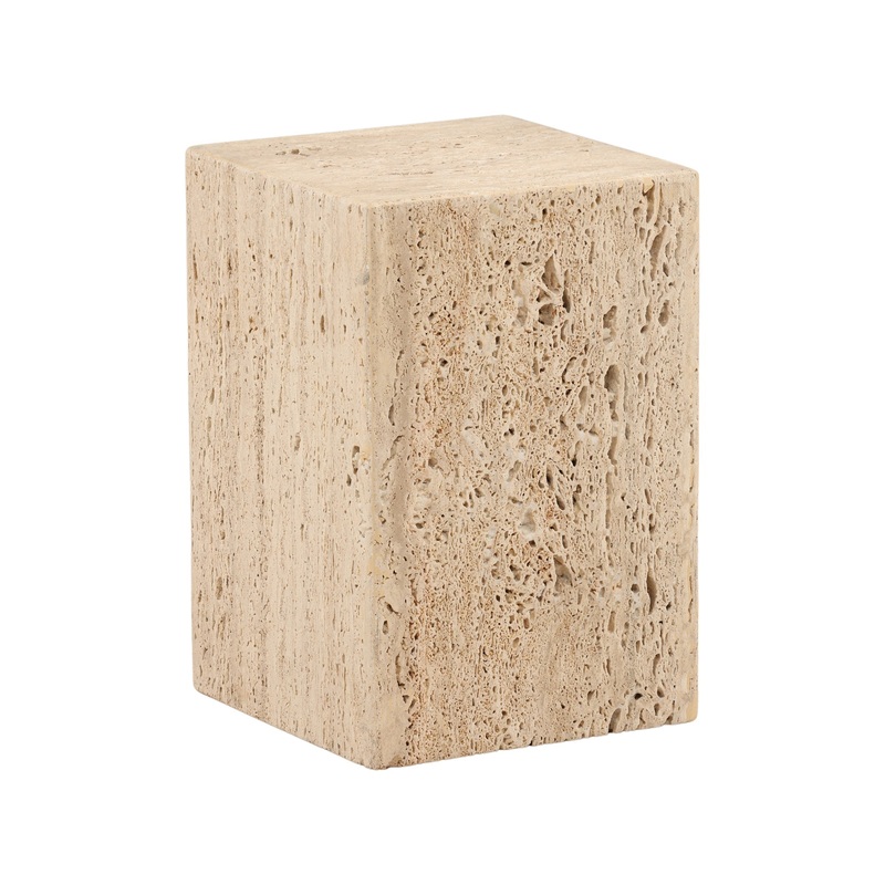 This tall sculptural side table is a study in material and form. Carved from a single block of natural travertine, its clean, architectural silhouette is beautifully contrasted by the stone’s raw, porous texture. The unique pits and natural veining make each piece one of a kind. This solid and powerful table is perfect for a small space or as an elegant pedestal to showcase a lamp or art piece.