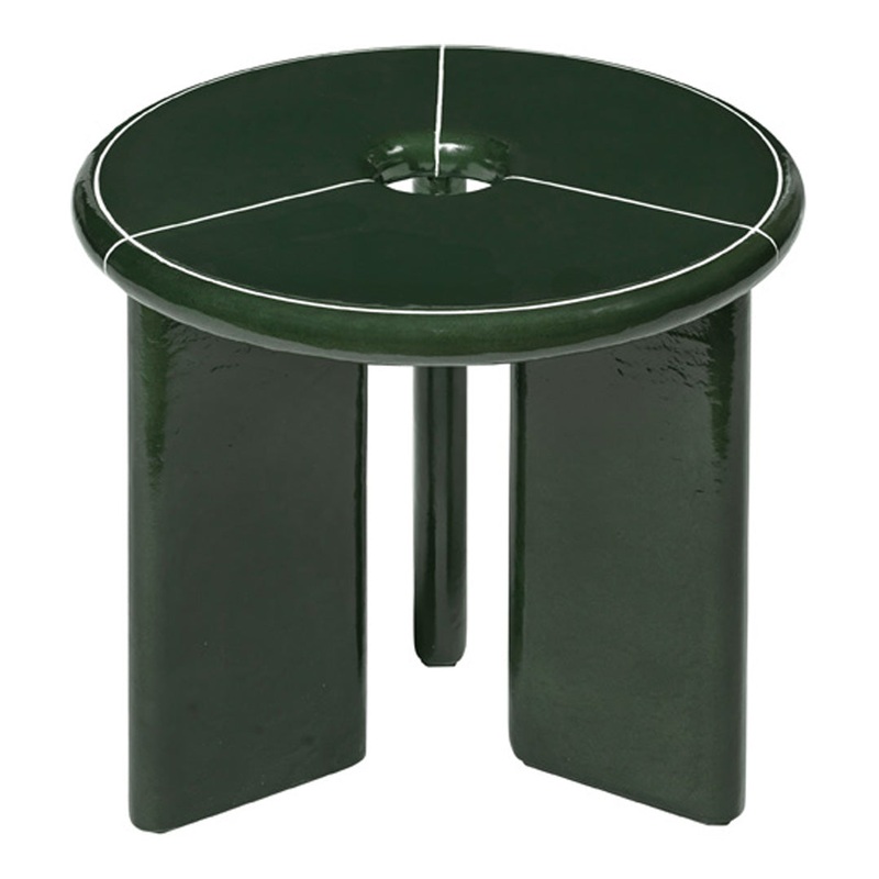 Crafted from fibre concrete, the Deya Side Table features a striking dark green glaze with an uneven texture, accentuated by off-white grout lines. The segmented tabletop introduces a bold geometric appeal, complemented by generously rounded edges for a softened presence. Balancing artisanal craftsmanship with bold geometry, the Deya Side Table is a versatile piece, suitable for both indoor and outdoor spaces.