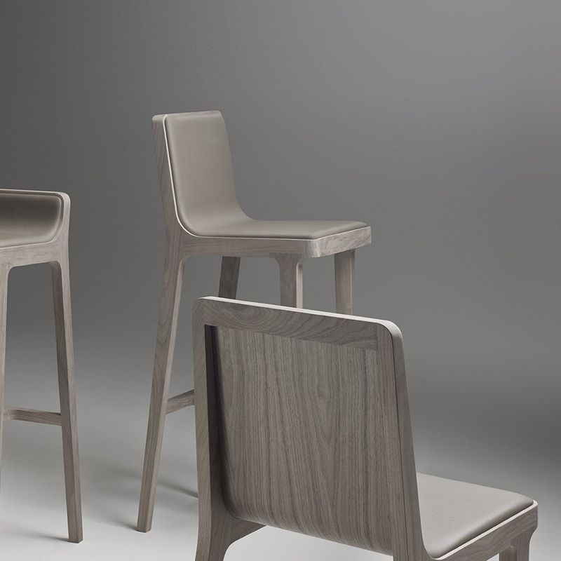 The Emea family has two stool heights (660mm and 810mm) and can be finished completely in oak or the seat can be covered in leather or fabric.