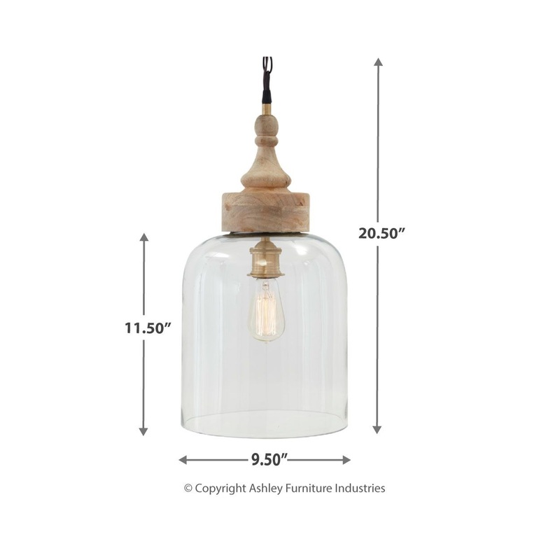 The mixed materials of this pendant light are right in line with the times. A turned natural wood finial crowns the alluring half-dome glass shade.