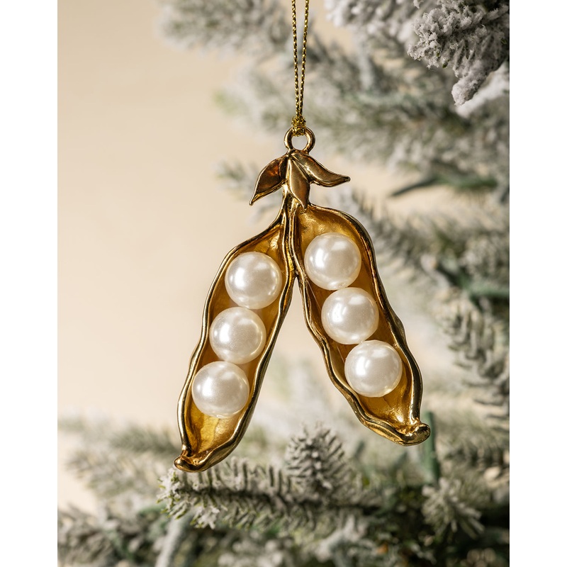 A unique take on the classic ornament, the Faux Pearl Pea Pod Ornament is effortlessly elegant. Featuring bright faux pearls in a gold-finished pod, the ornament offers both visual depth and enduring detail to your tree.