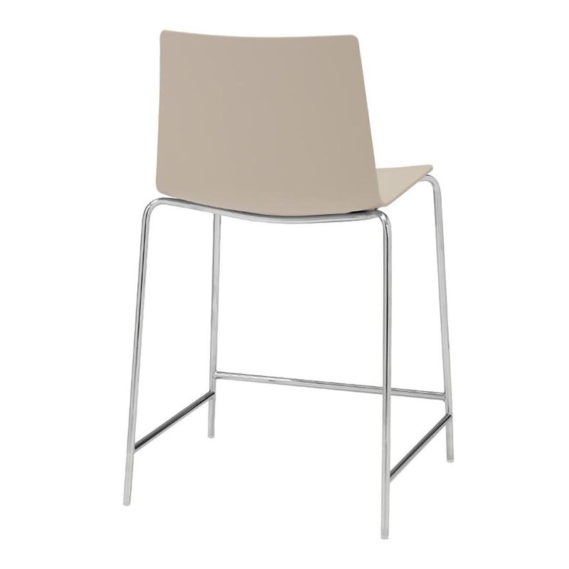 Counter stool with 4 tubular steel legs in polished chrome, white or black. Thermo-polymer seat and backrest available in several colors. Optional fully upholstered shell or parallel upholstery stitching.