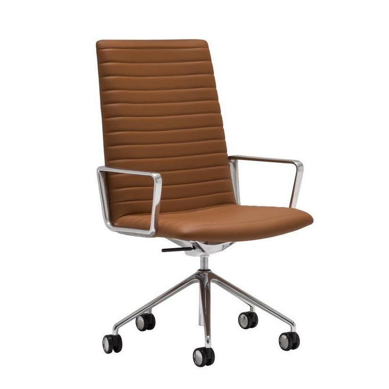 Intermediate back armchair with upholstered shell and height adjustable central swivel base with 5 casters finished in polished aluminum, white or black. Additional options include: parallel upholstery stitching, tilt mechanism and back finished in walnut veneer. Height Increase: Height 39-43 inches. Seat height 17.25-21.25 inches.