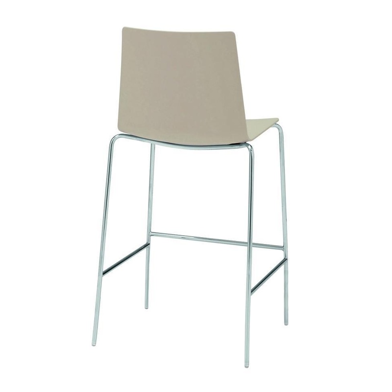 Barstool with 4 tubular steel legs and finished in polished chrome, white or black. Thermo-polymer seat and backrest available in several colors. Optional fully upholstered shell or parallel upholstery stitching.