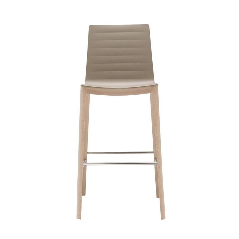 Barstool with thermo-polymer shell, available in various colors and four-legged solid beech wood base. Optional parallel upholstery stitching. Optional upholstered seat pad or upholstered shell pad.