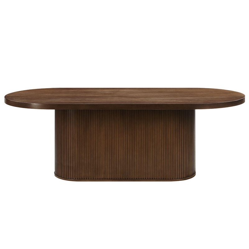 The Gamarya dining collection is designed to provide space for your guests in effortless convenience and tasteful style. This dining collection offers a contemporary vibe to your dining space. The oval tabletop and vertical reeding on the pedestal base lend a classical yet stylish take. The classic oak finish complements any decor style. The fluid curves of the dining chairs create fun and exciting pieces; to not only look at but also sit on. Pick between two dining chair styles or mix and match for a personalized look; both styles are upholstered in a crisp white fabric.