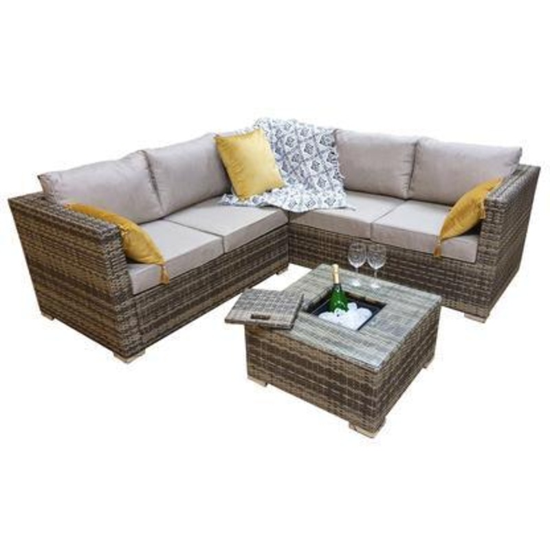 The GeorgiaCorner Group Sofa Set with Ice Bucketprovides the perfect setting for outdoor relaxation. The set includes a corner sofa made up of 2 parts, and it comes with a low glass-topped coffee table with ice bucket insert.The table includes a wicker lid to cover the ice bucket when it is not being used.The set includes all beige seat cushions and back cushions as shown.