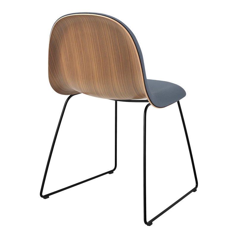 The GUBI Chair Collection is a chair series in laminated moulded 3-D veneer or in the injection moulded HiRek material. The shell is 5 mm thick. Both types of the shells can be delivered upholstered, with front upholstered or fully upholstered in fabric or leather. The base is available in steel, in different finishes, and moulded wood in various finishes. Several of the chair versions are stackable.