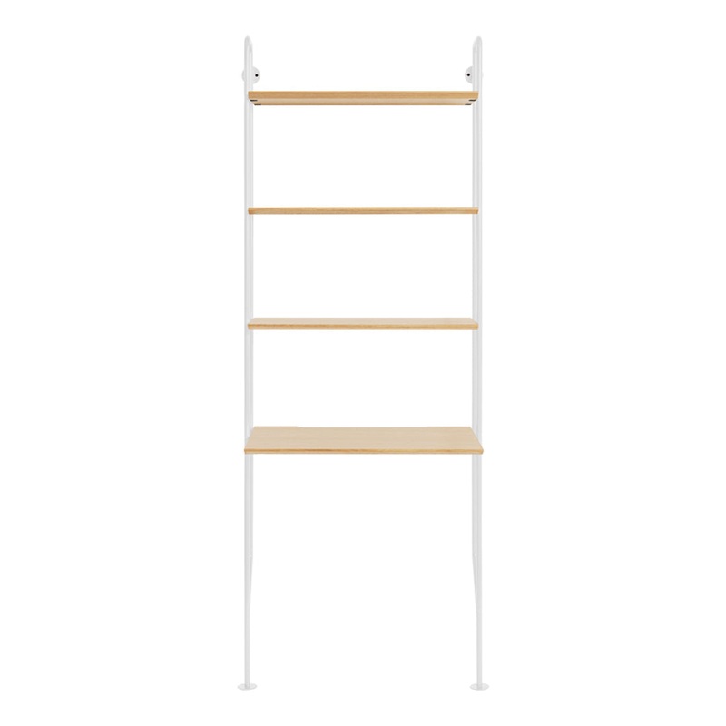 Engineered with both visual elegance and structural integrity, the system features two powder-coated steel uprights available in multiple distinctive color options, providing the complete framework necessary for independent installation. These slender vertical elements create a minimal yet sturdy foundation that allows the wood shelves and desk surface to appear as if floating against the wall, demonstrating Blu Dot’s talent for balancing visual lightness with functional stability.