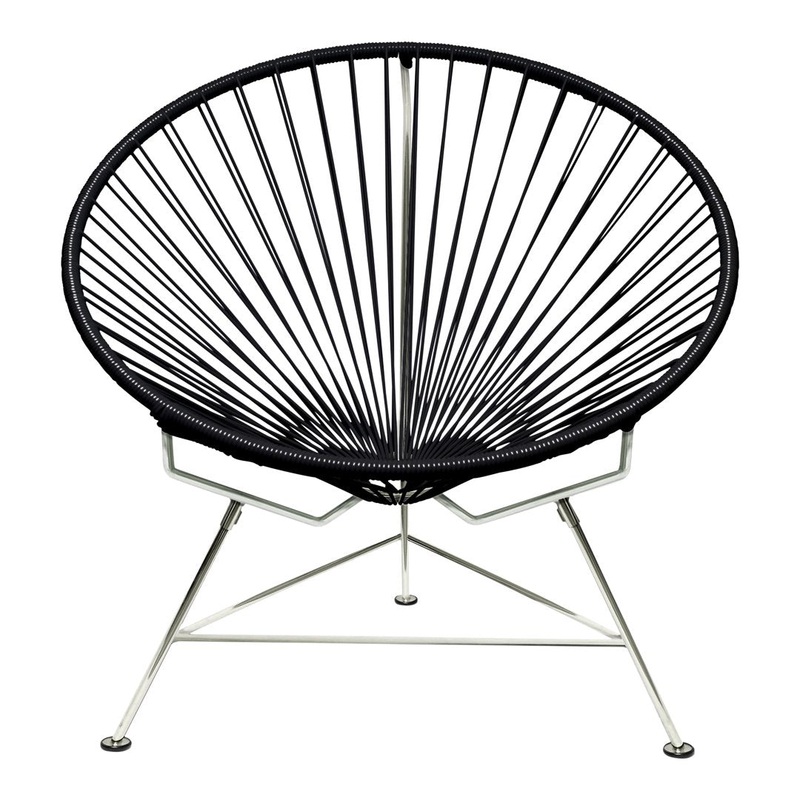 The Innit Chair – contemporary lounge or occasional chair suitable for indoors and out. Composed of a tripod metal base and seat woven with vinyl cord. The Innit chair is similar in construction and form to our Acapulco chair though slightly less reclined with a circular frame. The galvanized steel frame is rust resistant, and the very durable yet flexible, UV protected vinyl will stay colorfast for years. This chair is incredibly comfortable without a cushion. It’s weatherproof, breathable, stackable, easy to clean, and available in everybody’s favorite color. A great, modern design for commercial and residential applications. Pretty good innit