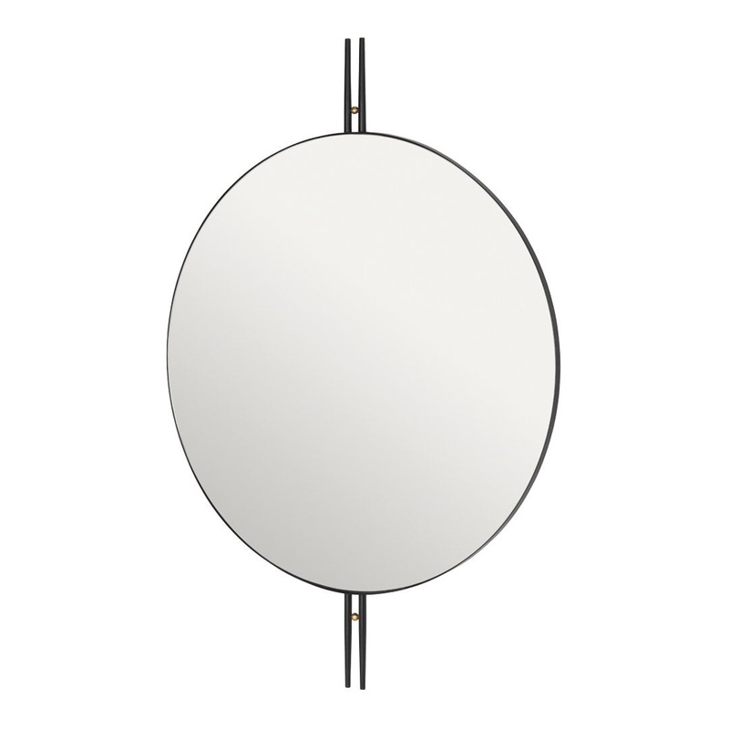 The brass sphere works as both a functional spacer to strengthen the dual pipe-like mirror struts, and as an intimately considered signature detail or pause that emphasizes both its own materiality and the careful attention paid to the spaces between the elements of each piece.