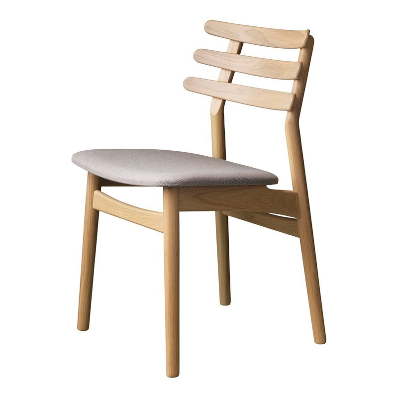 The J48 chair is Poul Volthers classic dining chair from 1951, which over the years has proved to be one of the most popular chairs in the FDB Mobler range. With its solid oak design, and the upholstered seat in either leather or textile, the J48 chair exudes quality. The rounded, separate back supports, similar to those on Poul Volthers Corona chair, provide a high degree of sitting comfort and an extremely aesthetic and uniquely original look.