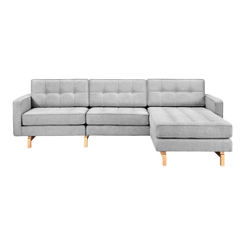 A modern update to the classic Gus* Modern Jane Series, the Jane 2 Bi-Sectional retains the iconic, mid-century look while adding contemporary enhancements. It has been cleverly designed so that it can be configured with the chaise on the left OR the right, depending on your floorplan. If your needs change, simply move the chaise and readjust the cushions to convert the design. Piped upholstery edges and button-tufted cushions create photogenic surface details that are enhanced by Jane 2s new, more refined proportions. A new wood base (available in light or dark wood finish) is inset on each piece, creating a sense of weightlessness that maximizes light and space. The frames are constructed with kiln-dried 100% FSC-Certified hardwood in support of responsible forest management.
