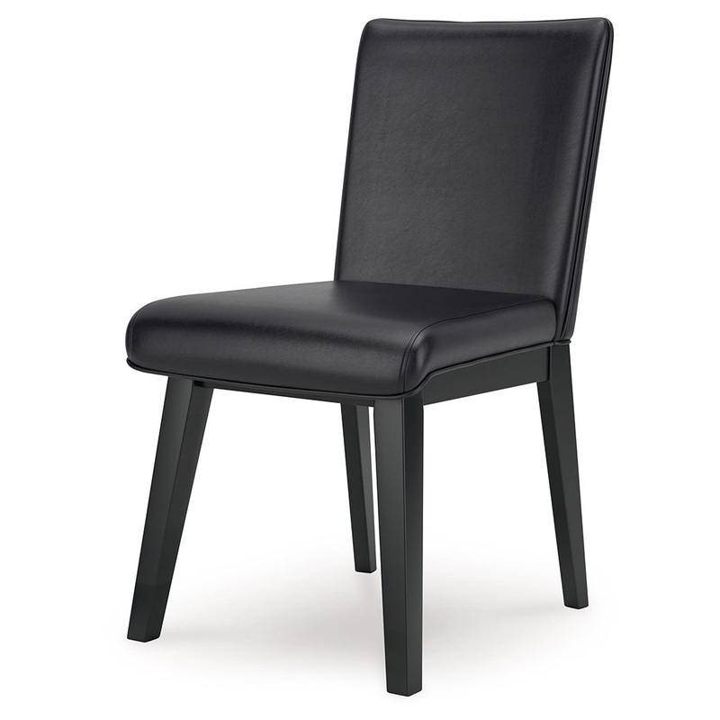 This dining chair exudes modern sophistication. Finished in a sleek black wood-tone with black faux leather upholstery for added comfort and style, it brings a beautifully balanced look to the table. A simply striking feast for the eyesnow your only worry is who to invite for dinner.