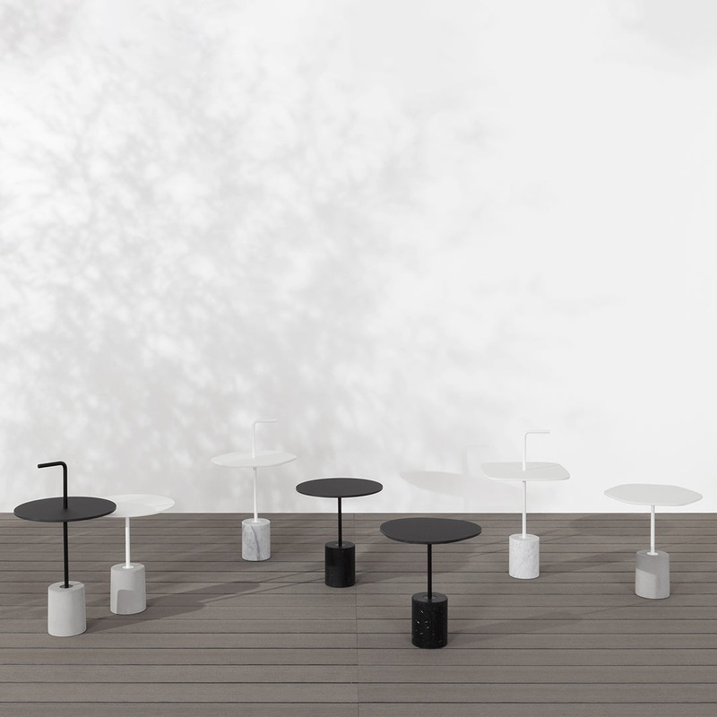 Occasional table with marble base white Carrara, black Marquinia or concrete. Stem and handle in stainless steel Aisi 316L, tops in laminate Fenix 10 mm.