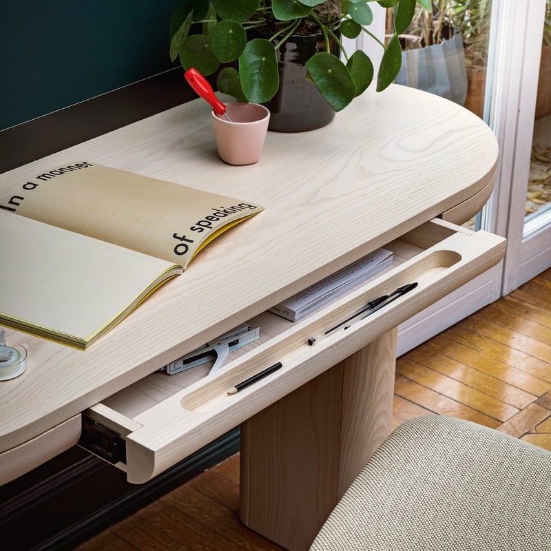 Jumbo is a solid looking writing desk designed to meet the challenges of the home office or limited space of bedrooms. A band of metal embraces the top, embellishing its volume. Jumbo also features a small drawer to please treasure hoarders.