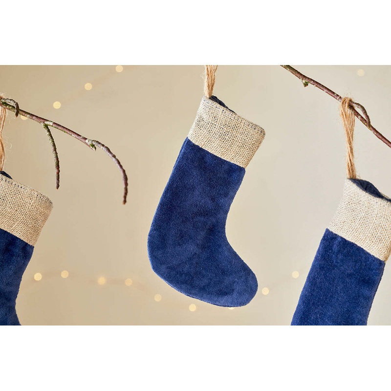 The new indigo tones of the Karru stockings introduce a traditional festive colourway to our Karru collection. They use a soft, luxurious cotton-velvet material that contrasts against the natural texture of the linen top. This is a miniature set of 3 of our popular full-size stockings, perfect for decorating a fireplace, hanging on the tree, or adding festive joy to shelving and side tables. Each stocking has a practical hanging loop.