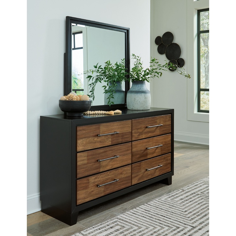 Experience the captivating allure of this dresser and mirror set, an effortless blend of casual and refined aesthetics. Its two-tone finish combines satin black with a rich brown wood tone for a modern, relaxed vibe that you’ll love waking up to. Perfectly suited for your contemporary home, this set has plenty of drawer space to tuck away your wardrobe and spare bed linens.