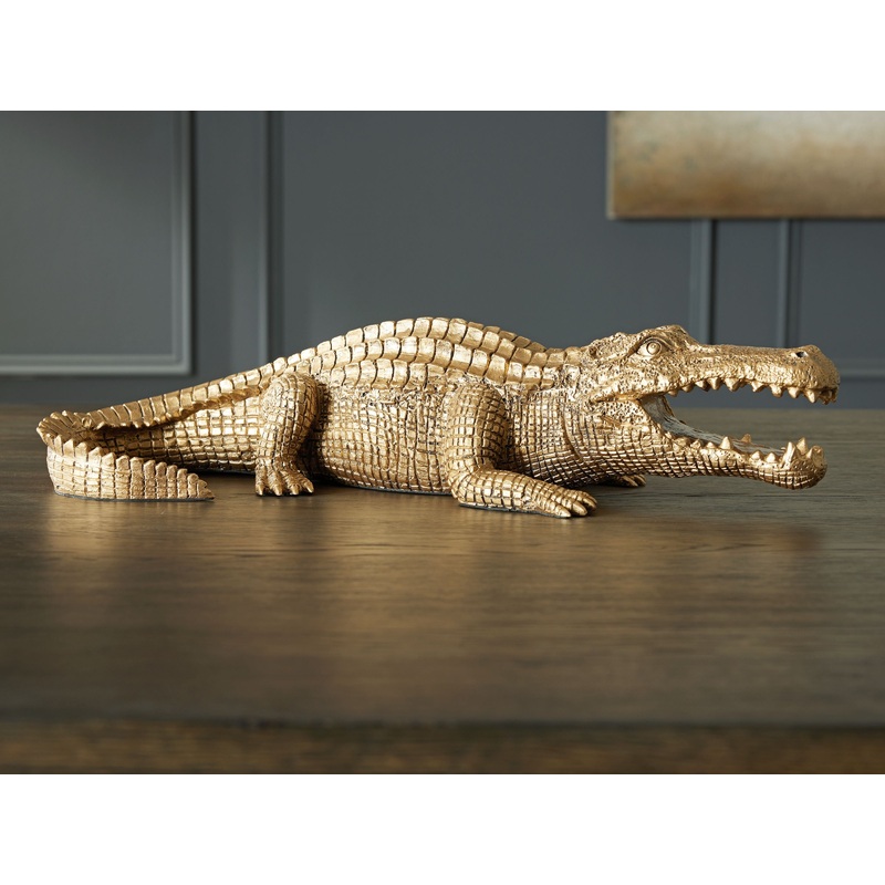 This sculpture brings a glam appeal to wild style. Luxe in an antiqued goldtone finish, the alligator-shaped art piece is a snappy addition to your office or living room decor. Its remarkable attention to detail captures the animal’s likeness in decidedly contemporary fashion.