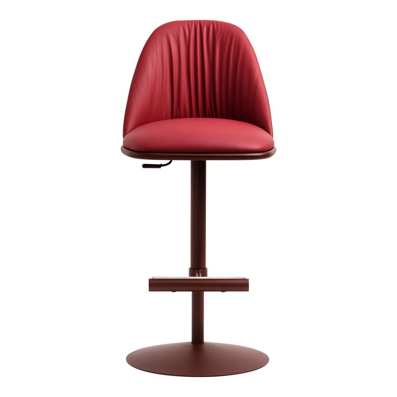 Lea Deluxe stool with swivel and height adjustable base in metal. Seat and backrest upholstered in fabric, leather, or faux leather customizable with different fabric or color for front and back.