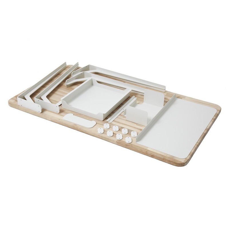 The solid wood top has a removable plate that allows easy access to a storage tray hiding unsightly plugs and cables. Other accessories include a small draw for a laptop or papers, a file holder and a back panel that can act as a note board or in an open space as a privacy screen.