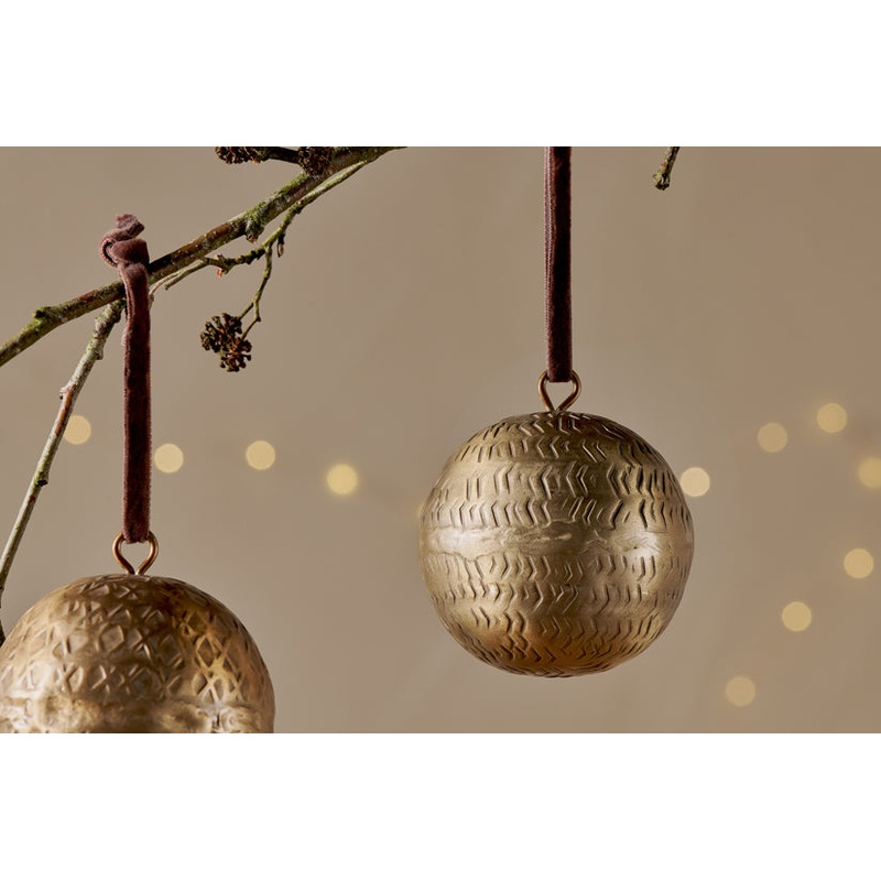 Each one of these striking baubles has a different pattern across its surface, making them a beautiful and unique addition to your Christmas decorations. The patterns were created by hand, with the artisans using traditional tools to hammer the metal. The warm polished brass has a festive feel and looks even more magical when it reflects the lights from your tree. Their classic round shape and the time-honoured techniques used by the metalworkers mean you can enjoy using these baubles year after year. Comes as a set of three with soft brown velvet ties.