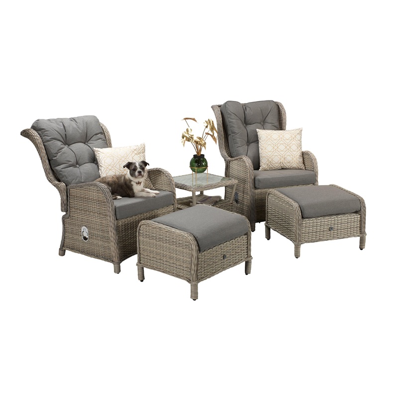 The Meghan Reclining Lounge set comes with 2 reclining armchairs, 2 footstools and a small side table.Why not relax in your outdoor space with this set which allows to recline back at look at those blue summer skies?
